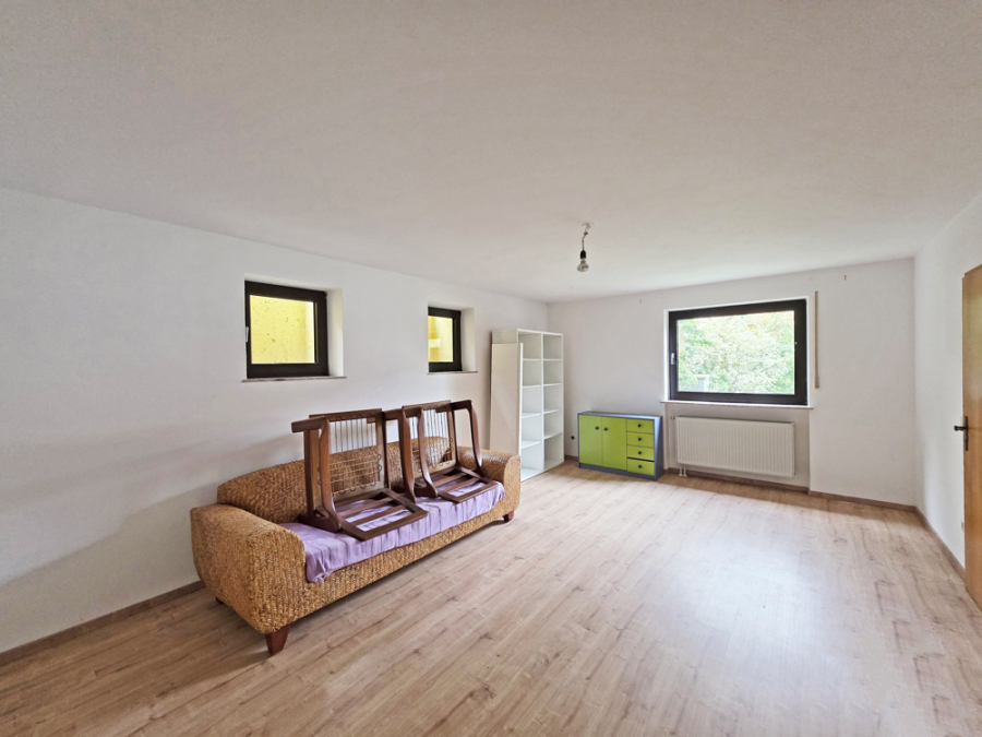 Der Hobbyraum verfügt über einen eigenen Hauseingang und ein normales Fenster. Direkt daneben liegt ein weiteres WC mit Duschbad und ein Waschmaschinenanschluss.