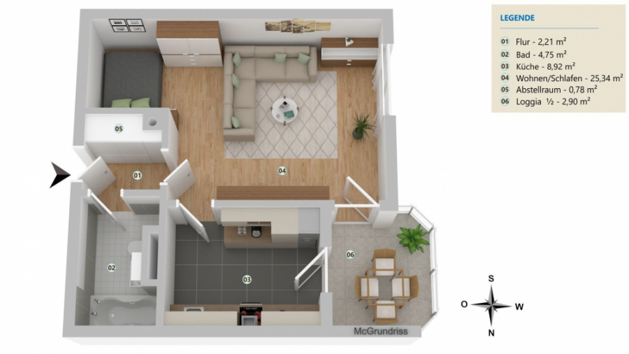Die im Grundriss dargestellte Möblierung ist lediglich beispielhaft. Die Wohnung wird (bis auf die Einbauküchte) unmöbliert und ohne Dekoration vermietet.