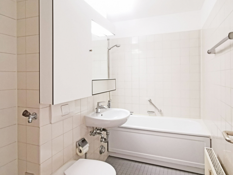Das innenliegende Wannenbad mit hellen Fliesen bietet Ihnen auch einen Waschmaschinenanschluss.