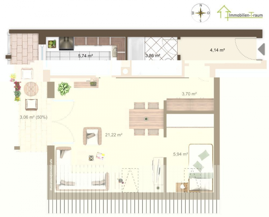 Bitte beachten Sie, dass der Grundriss nur maßstabsähnlich sind und der Illustration dienen, er ist nicht maßstabsgerecht! Die Möblierung im Grundriss stellt lediglich einen Möblierungsvorschlag dar; die Wohnung wird bis auf die Einbauküche unmöbliert vermietet!