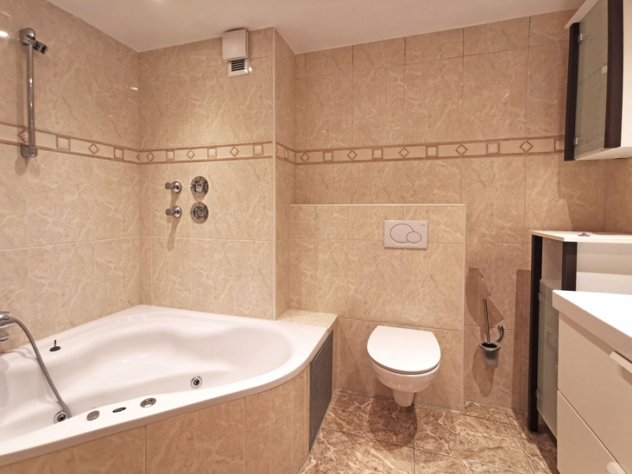 - einem edlen Badezimmer mit Eckbadewanne und cremefarbenen Fliesen